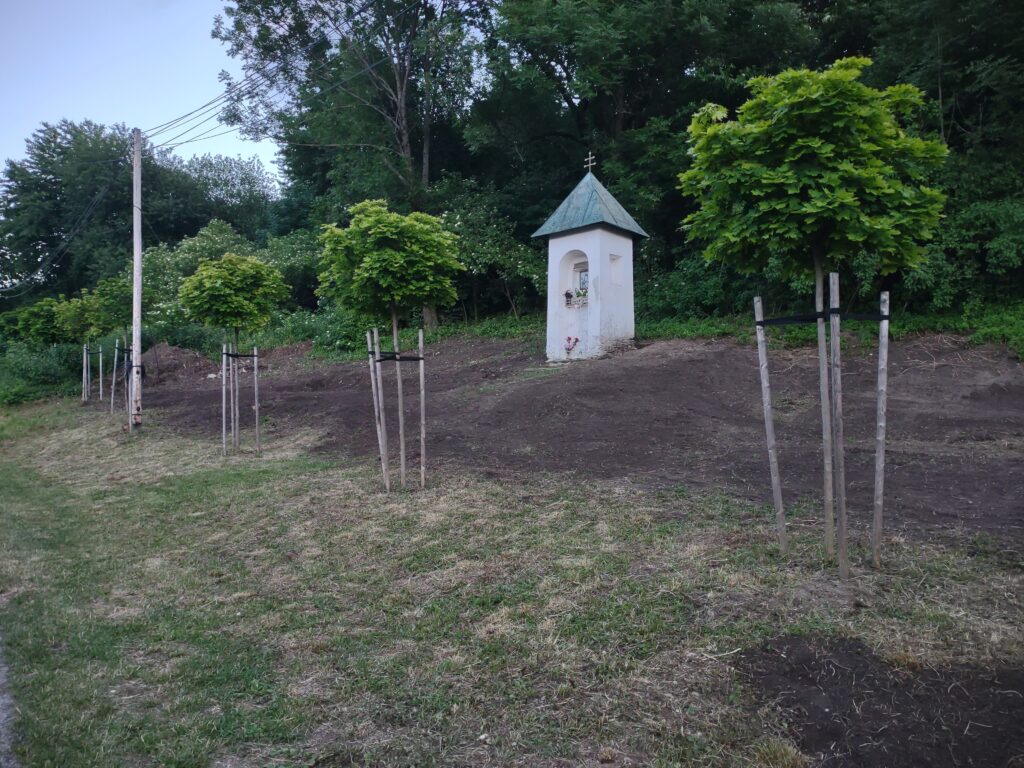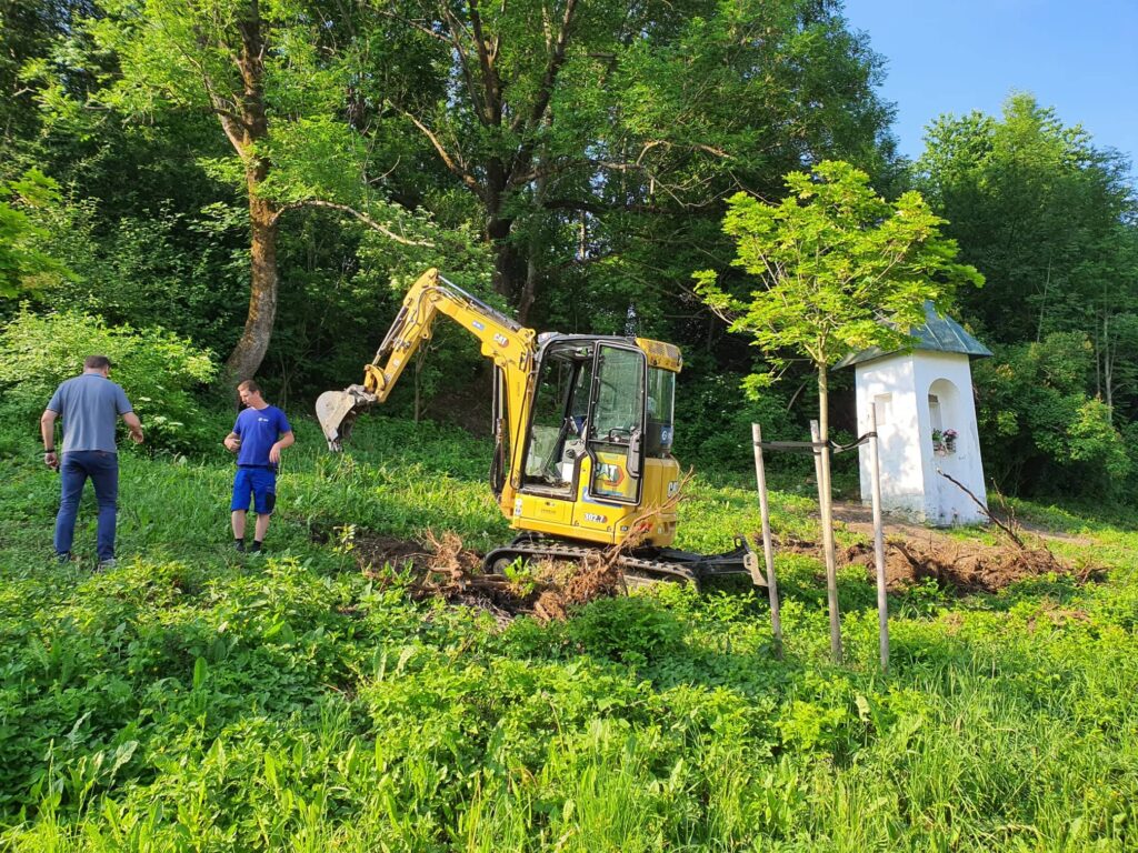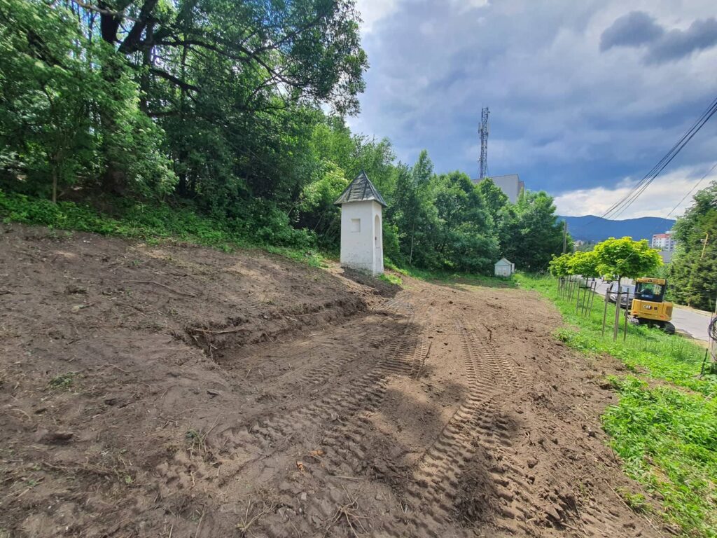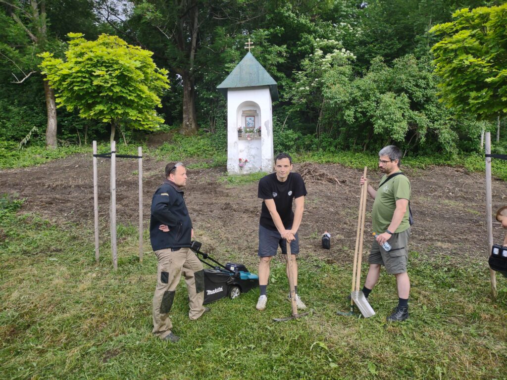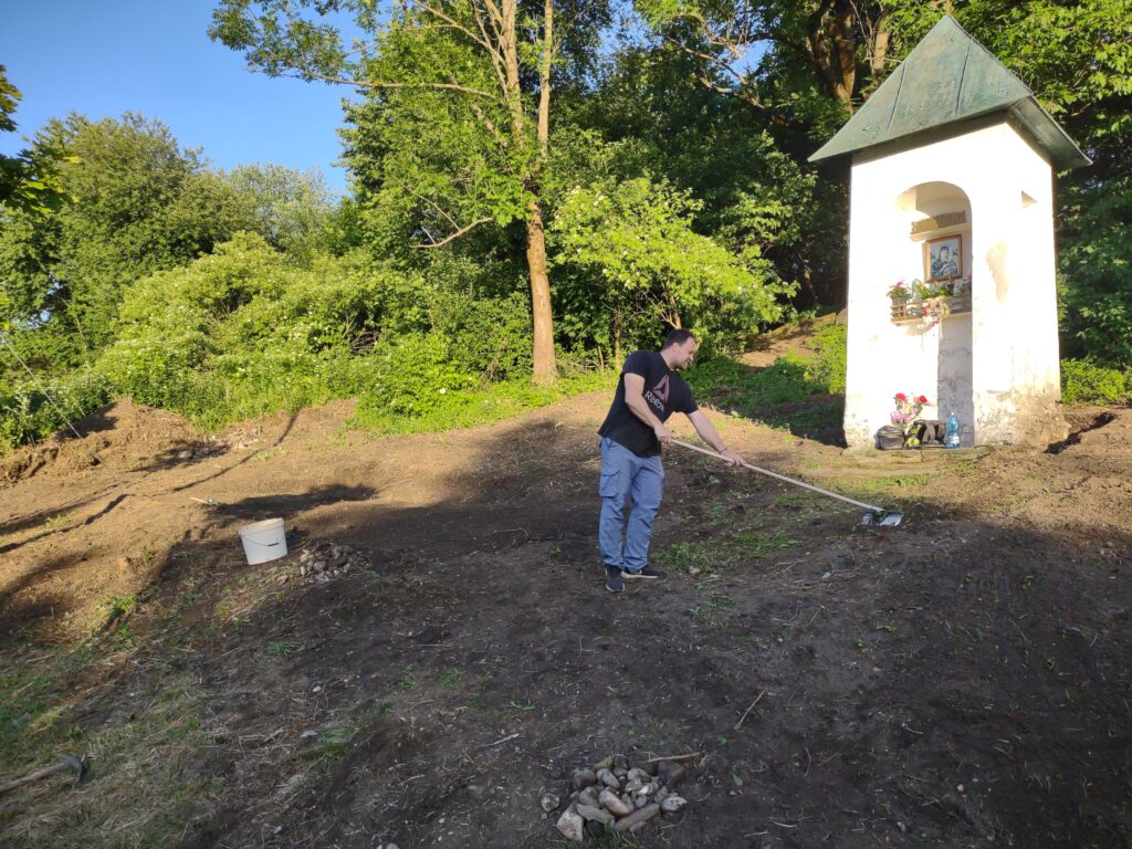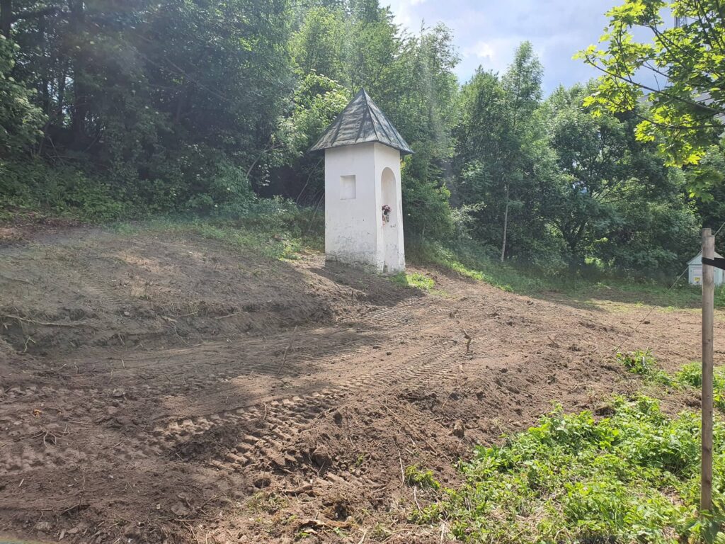 Takto to vyzeralo na začiatku, keď sme vyčistili od koreňov, kameňov, množstva skla, plechoviek a ďalšieho odpadu a náletových drevín. Zároveň sme vykopali drenážny výkop okolo Božej muky, ktorú sa chystáme odizolovať.