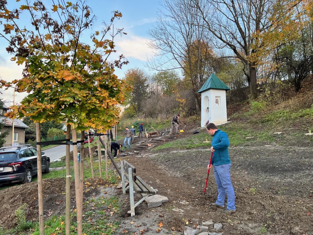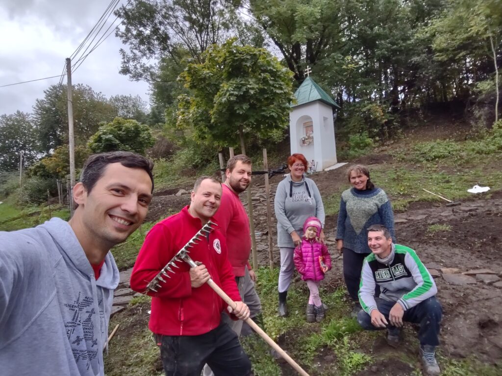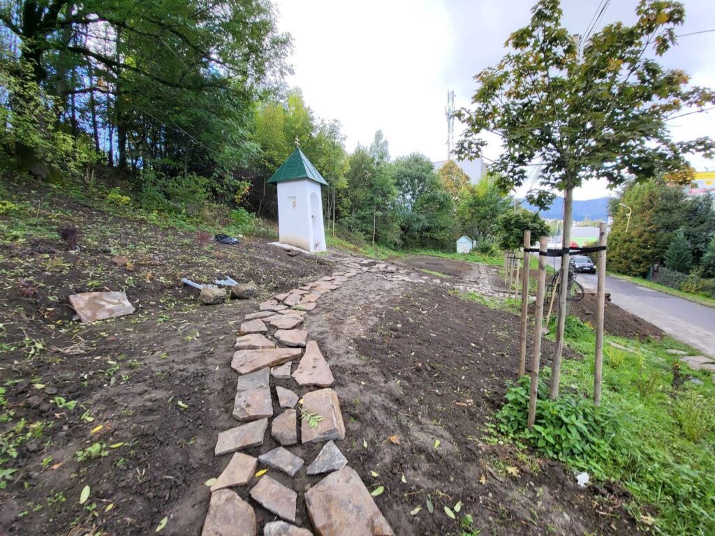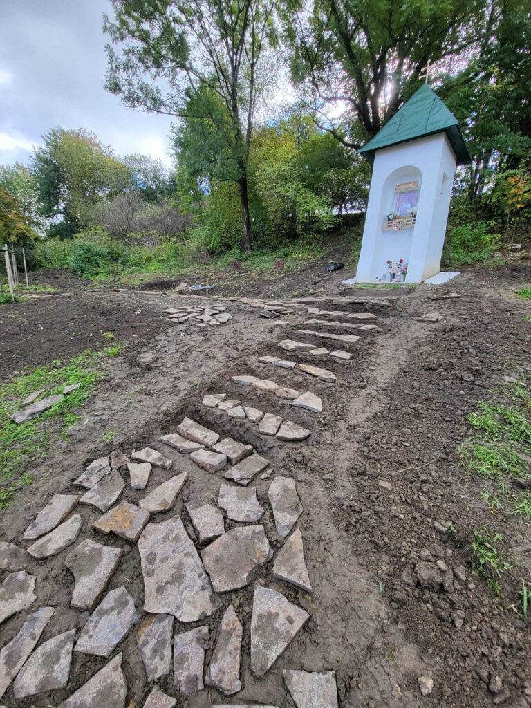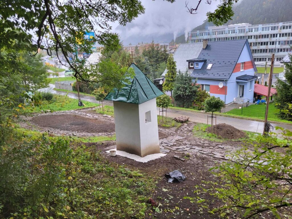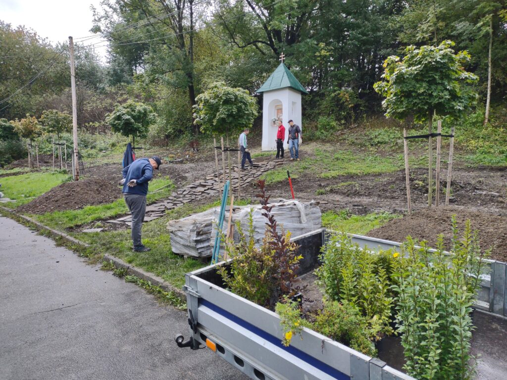 Takto to vyzeralo v tretej fáze projektu, keď sme začali vyrábať cestičky, schody, osádzať lavičky, smetné nádoby, ale aj vysádzať kvety. S prácami na Božej muke (drenážovanie, nový náter strechy, nová omietka) nám výrazne pomohla ochota majiteľov Liptovskej stavebnej spoločnosti, s. r. o. Patrika Haba a Ľubomíra Sidora poskytnúť odbornú pracovnú silu a techniku.
