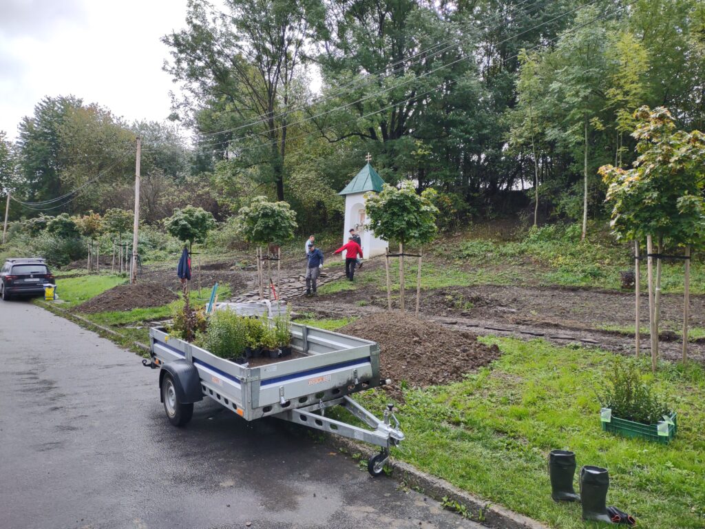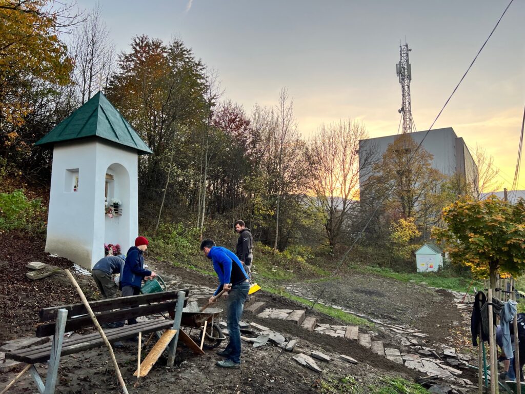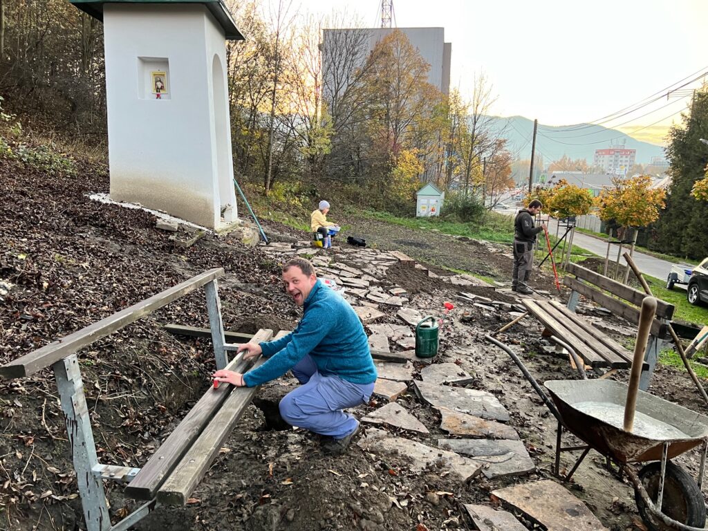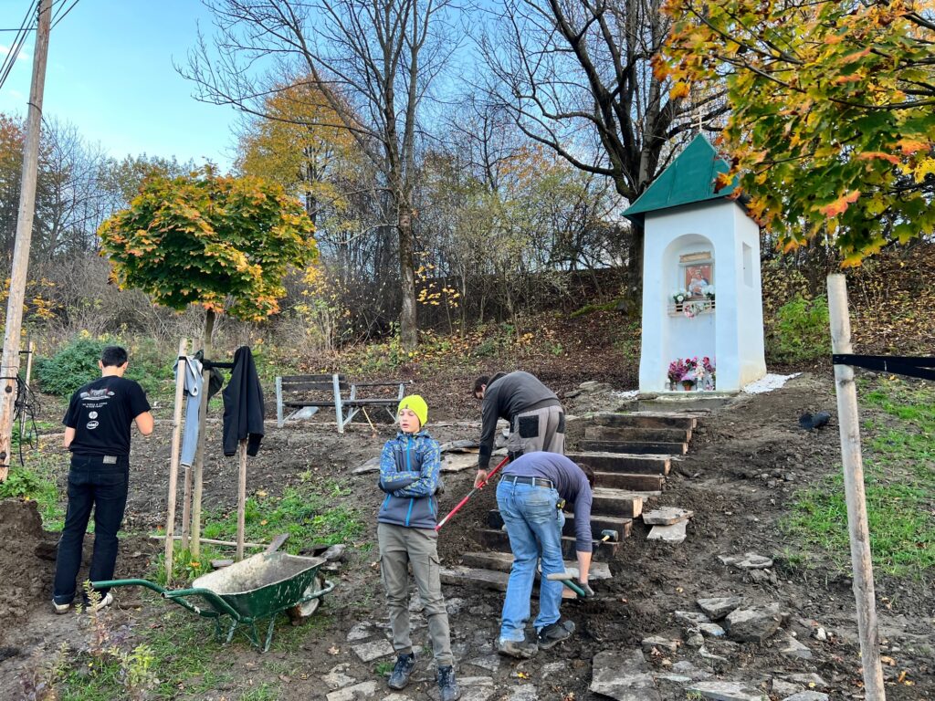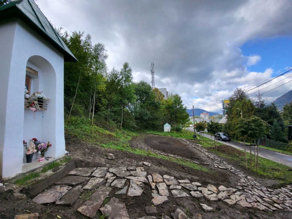 Takto to vyzeralo v tretej fáze projektu, keď sme začali vyrábať cestičky, schody, osádzať lavičky, smetné nádoby, ale aj vysádzať kvety. S prácami na Božej muke (drenážovanie, nový náter strechy, nová omietka) nám výrazne pomohla ochota majiteľov Liptovskej stavebnej spoločnosti, s. r. o. Patrika Haba a Ľubomíra Sidora poskytnúť odbornú pracovnú silu a techniku.