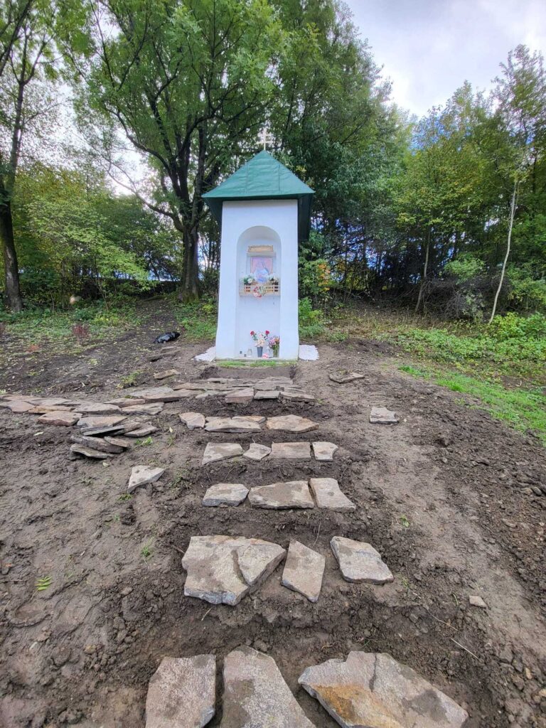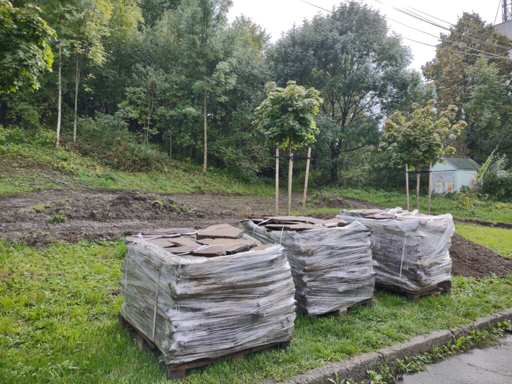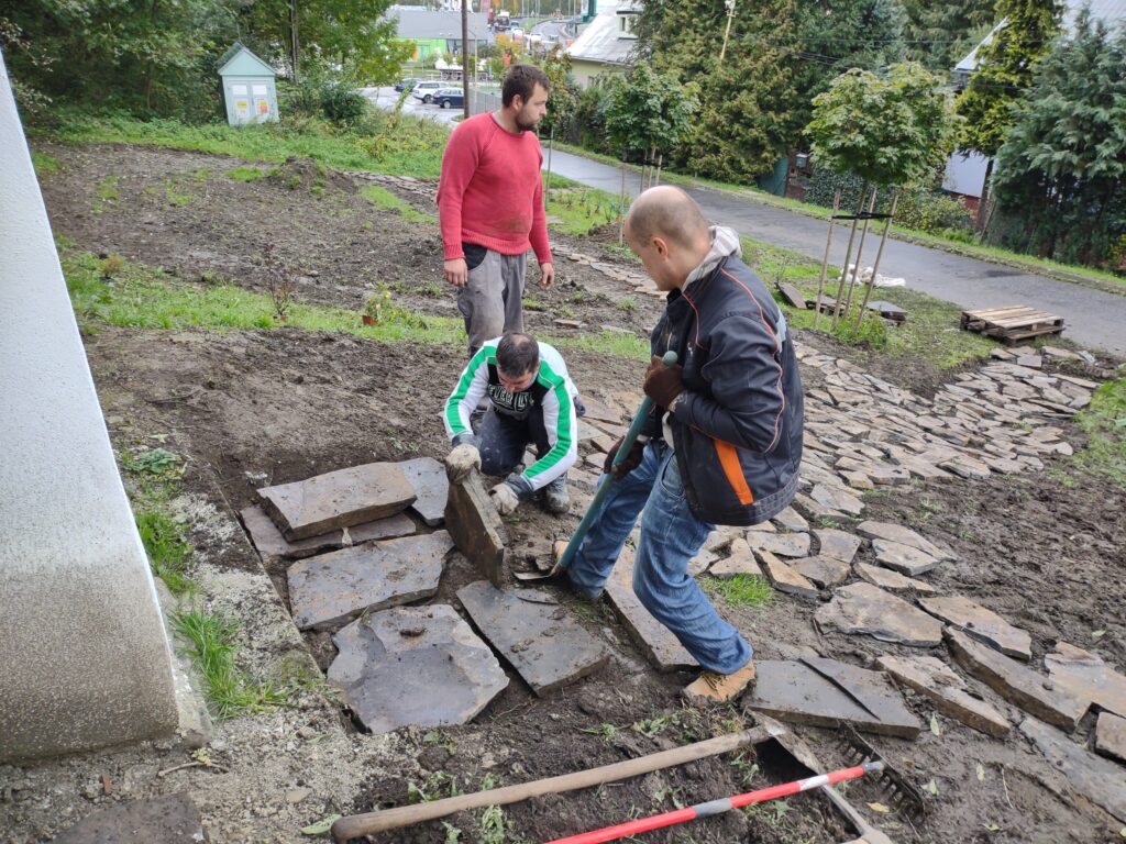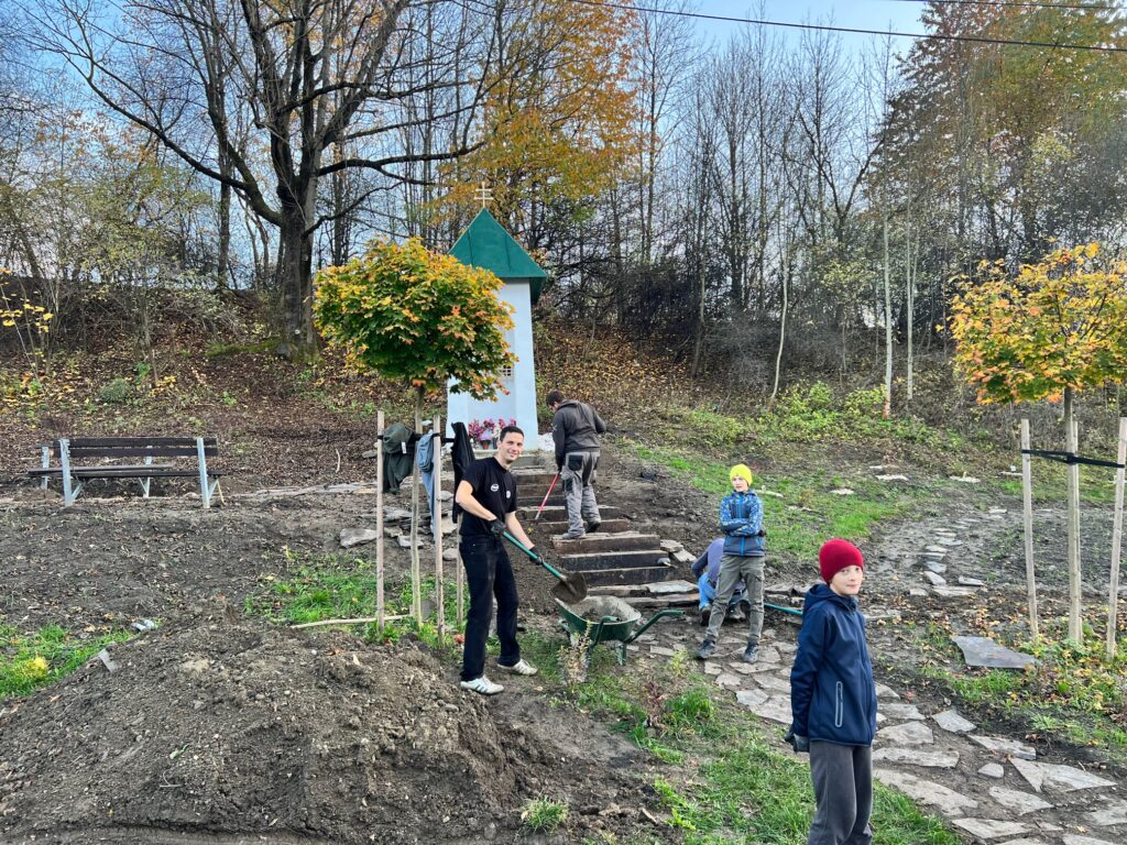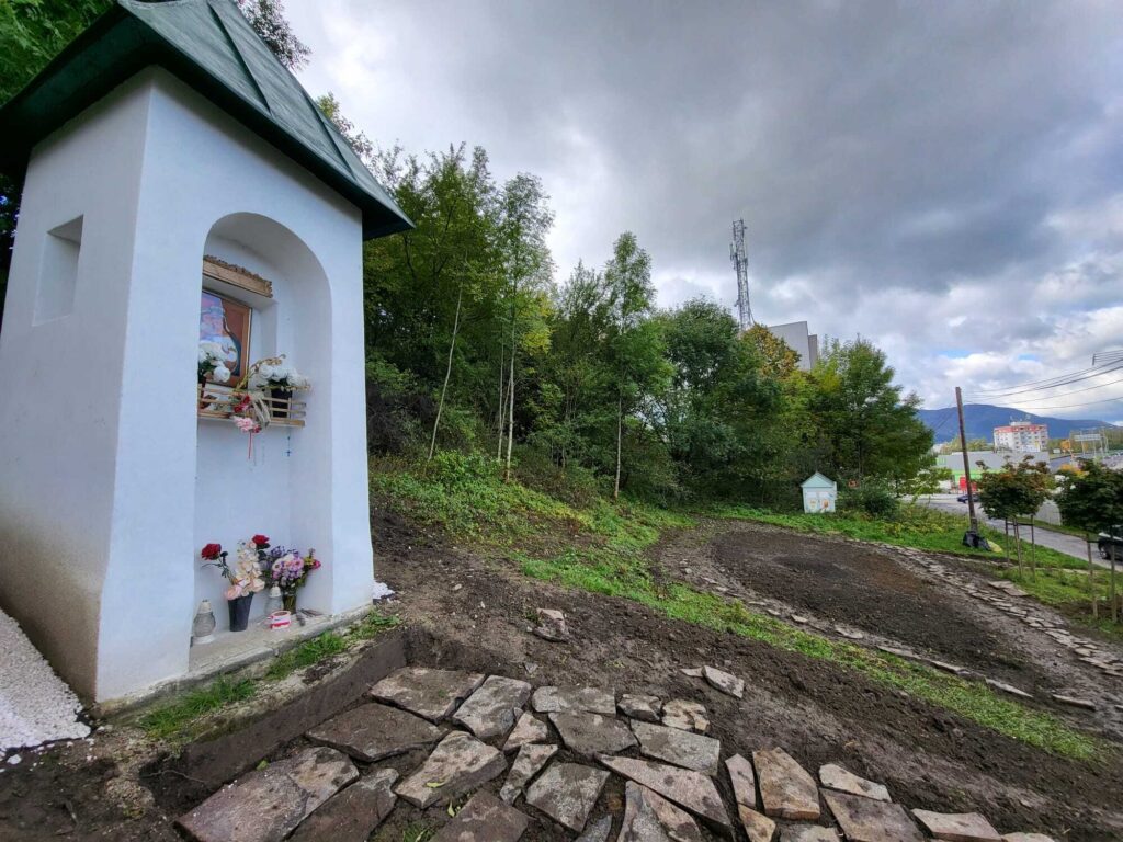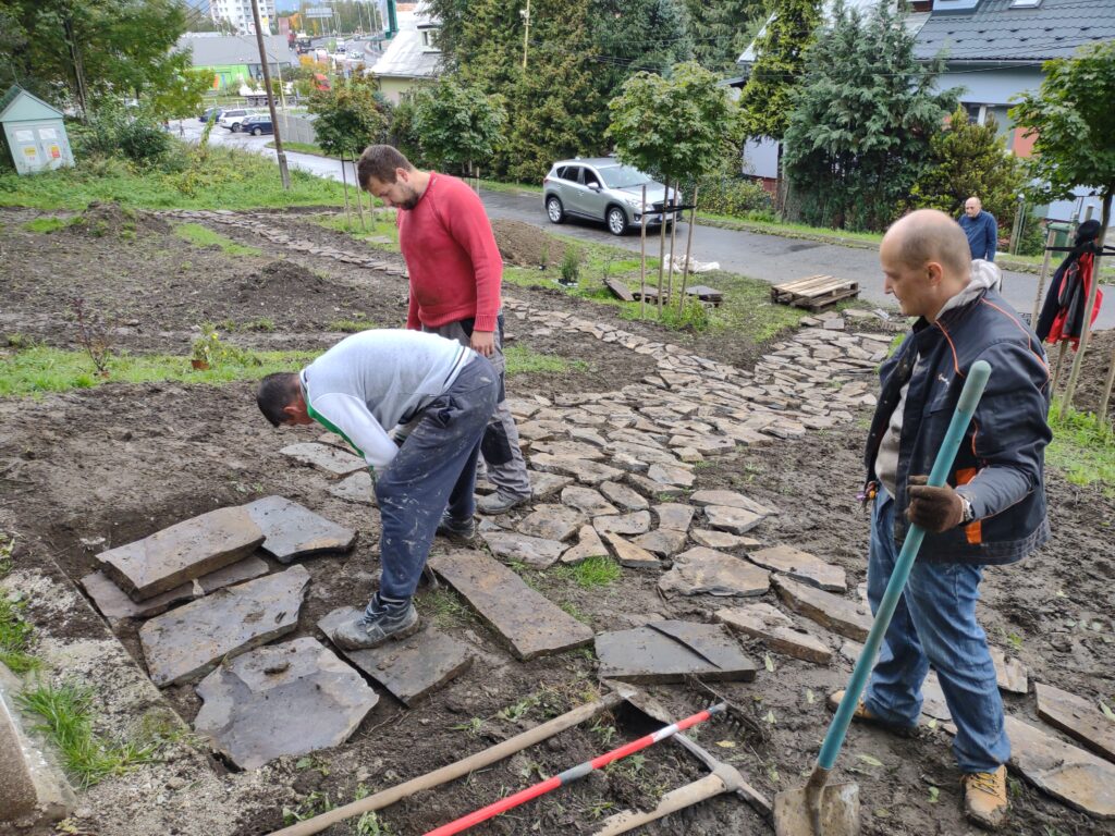 Takto to vyzeralo v tretej fáze projektu, keď sme začali vyrábať cestičky, schody, osádzať lavičky, smetné nádoby, ale aj vysádzať kvety. S prácami na Božej muke (drenážovanie, nový náter strechy, nová omietka) nám výrazne pomohla ochota majiteľov Liptovskej stavebnej spoločnosti, s. r. o. Patrika Haba a Ľubomíra Sidora poskytnúť odbornú pracovnú silu a techniku.