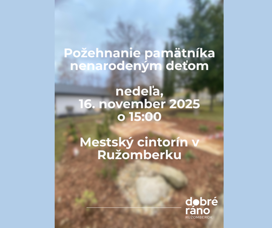 Všetkých srdečne pozývame, už v nedeľu, 16. novembra o 15:00, kedy bude požehnaný Pamätník nenarodeným deťom na Mestskom cintoríne v Ružomberku.